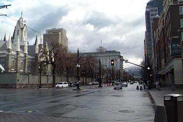 | Here is a view of downtown Salt Lake city, including the Mormon Temple Square on the left, as well as the snow capped Rocky Mountains in the background. Streets in SLC are all very wide, 132 feet, as originally laid out by Brigam Young and the first settlers here. |