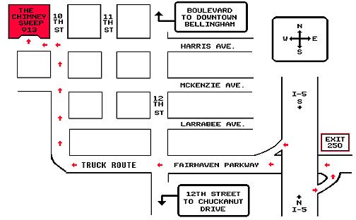 The Chimney Sweep is located in Old Fairhaven, on the South Side of Bellingham, WA, about 90 miles North of Seattle and 30 miles South of the Canadian Border.From Interstate 5, take the Old Fairhaven Parkway/Alaska Ferry Exit (250), head West on Old Fairhaven Parkway, through the traffic light at 12th Street, and onto the truck route. Follow the truck route as it curves North, turn left (West) at the stop sign on Harris Avenue, and come on in! |