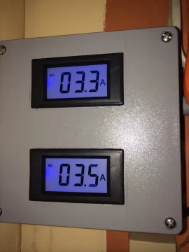 The a new Eaton Cutler Hammer panel was installed with nipples to a panel meter box on the upper left side. The current transformers must be installed in the circuit panel box on the 2 mains. A 120v switched outlet with a 120vac to 12vac step down transformer to power the current monitor displays and circuitry on the lower left side.