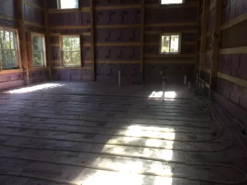 Low maintenance was the thought, 10mm vapor barrier with 2in foam with 5- 300ft loops of pex staples to the foam with rebar on top of that and then 5in of 5000psi concrete hooked to a Bosch 151k btu combi boiler