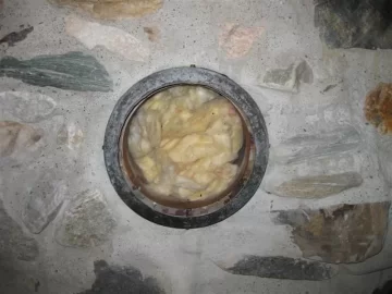 When cleaning up our hearth, I noticed I could see outside light around the thimble area of the chimney. I went outsided and moved back the unattached trim ring, I could see some pretty big gaps in the block.