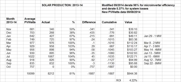 Hard to believe that one full year of PV is in the bank. The market was "down" a bit, with an ROI of 4.58% vs 5.18% had the Average PVWatts production been met. The "loss" occurred primarily in Nov, Dec and Jan, with production falling short by 991 kwh, and the balance of the year failing to meet average by 182 kwh. No complaint, however, because the same money invested in a CD would have produced only about a 1% return on a one year CD. But, one year does not an average make, so on to Year 2 and wait and see what the outcome will be.
