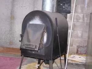 A life safety nightmare. Note the white around the door from overfiring Note the galvanized connector pipe