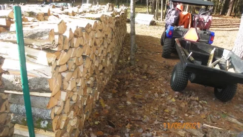 The shed I put up last winter and filled with mostly green oak is drying well (shrunk a lot), but the older covered stacks outside do not seem to have dried at all this summer. I think a second shed is in order so that I can get rid of all the outdoor stacks and free up space in the barn.